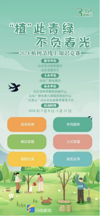 阳春三月,万物复苏,“草木蔓发,春山可望”,为迎接我国第46个植树节,宣传习近平生态文明思想,增进师生的生态文明意识,鼓励大家植树护绿、热爱自然,威廉williamhill新闻学党支部和本科生党支部师生于3月8日至12日联合参加由山东广播电视台主办的“2024植树节线上知识竞赛”。
