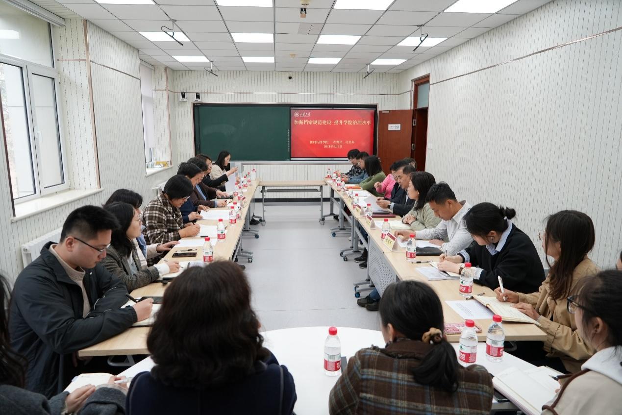 孙宜山表示,欢迎档案馆、校史办的领导和同志们到学院指导工作,感谢对学院档案规范化建设工作给予帮助与指导。档案工作是学院学科建设、人才培养等工作的基础,档案建设专业性强,学院应充分认识其重要性,进一步开展标准化、规范性档案建设。学院结合专业特色加强校史、院史研究,与档案馆优势资源共享,对做好独立建院十周年院庆工作奠定基础。