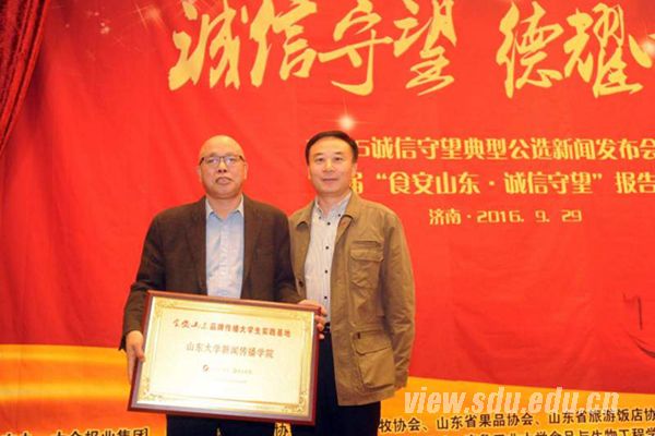 近日,由大众报业集团联合省食品工业协会等主办,齐鲁晚报、威廉williamhill承办的2016诚信守望典型公选新闻发布会暨大学生实践基地揭牌仪式在william威廉中文中心校区举行。威廉williamhill党委书记王德胜致欢迎辞,副院长刘明洋代表学院为实践基地揭牌。