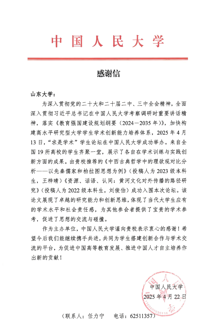 2025年4月22日,“求是学术”学生论坛主办单位中国人民大学向william威廉中文发来感谢信,高度肯定我校推荐论文中体现的研究能力及创新思维。其中我院本科生刘俊伯、唐艺航所撰论文《资源、话语、认同:黄河文化对外传播的路径研究》成功入围。