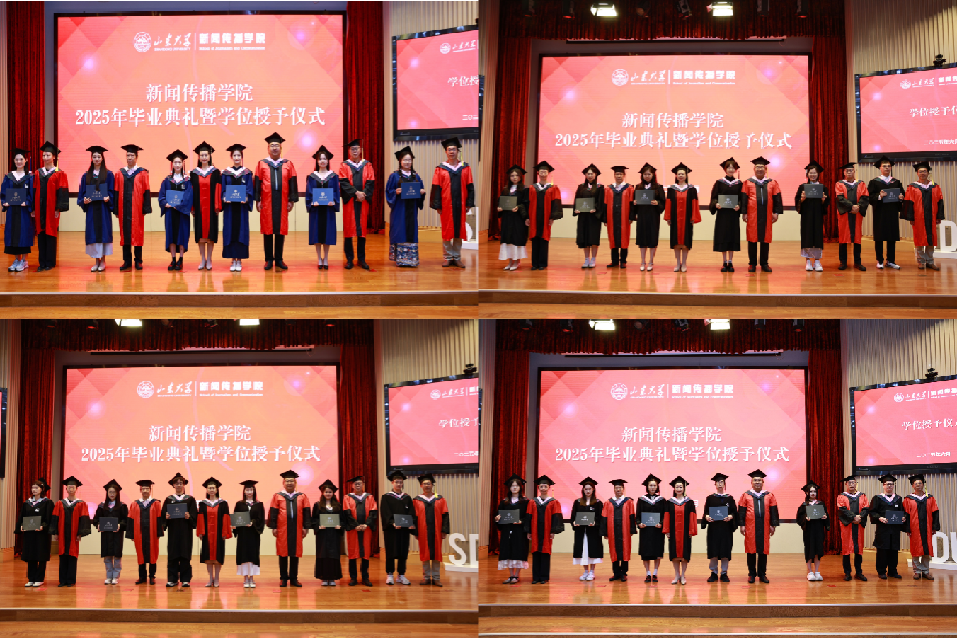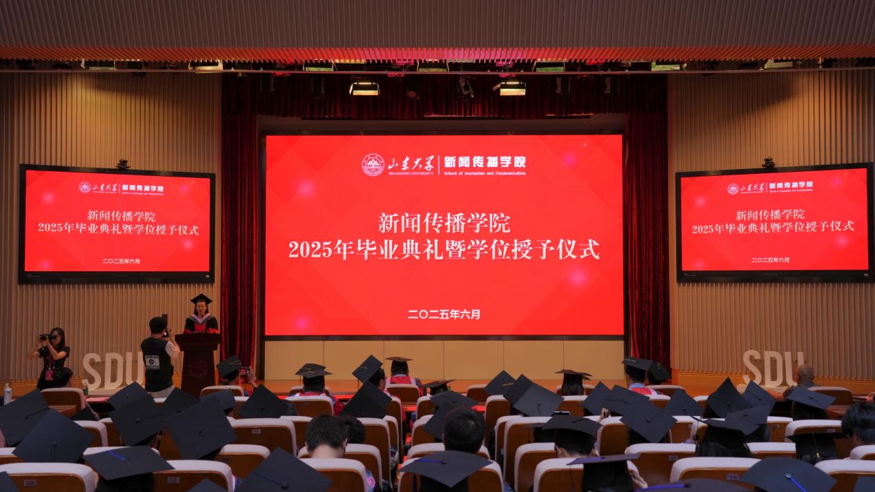 研究生毕业生代表万钊廷在发言中回顾了求学岁月中的成长与收获,学院不仅仅教授了大家传播理论和实践技能,更点燃了追逐真理、记录时代的责任担当。他希望同学们铭记“学无止境,气有浩然”的校训,永葆学习热情,坚守新闻理想,将个人理想融入国家发展伟业。最后,他代表全体硕士毕业生向学院、老师、家人致以感谢,祝愿母校、老师和同学们未来光明,并作为校友理事鼓励大家在各自岗位上赓续山大基因,闪耀山大之光。