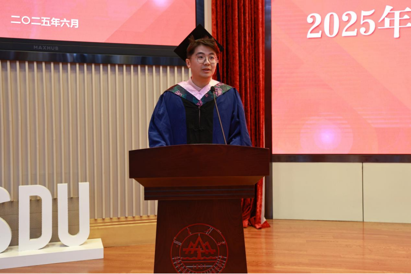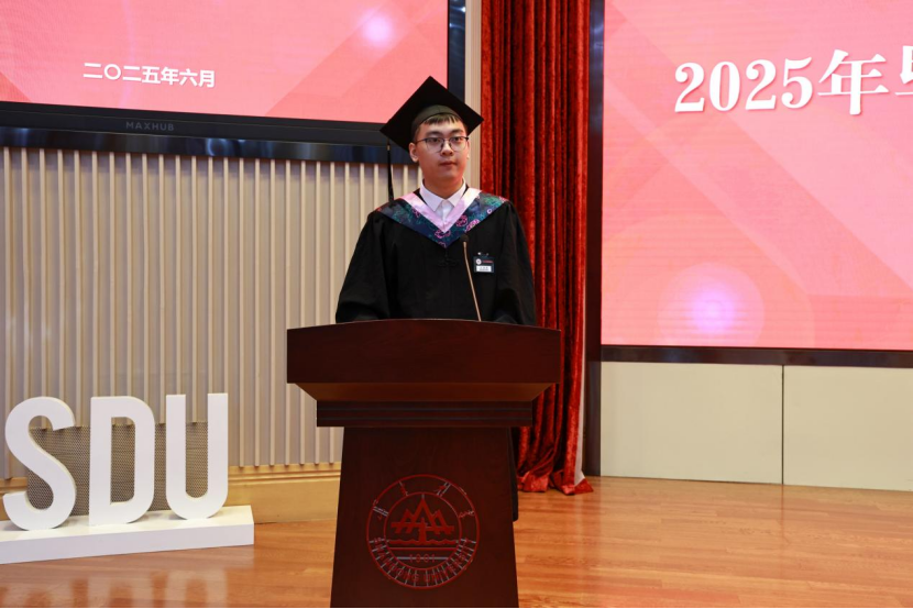 随后发言的本科生毕业生代表艾琨林回顾了同学们四年来从青涩到成熟的成长历程并感谢学院和老师的辛勤培育;“家国情怀、担当精神、崇实品格、创新素养”已成为同学们的行动指南。希望同学们带着山大精神奔赴基层、服务社会,为强国建设和民族复兴贡献力量。最后,他祝愿学院、老师和同学们未来一切顺利。