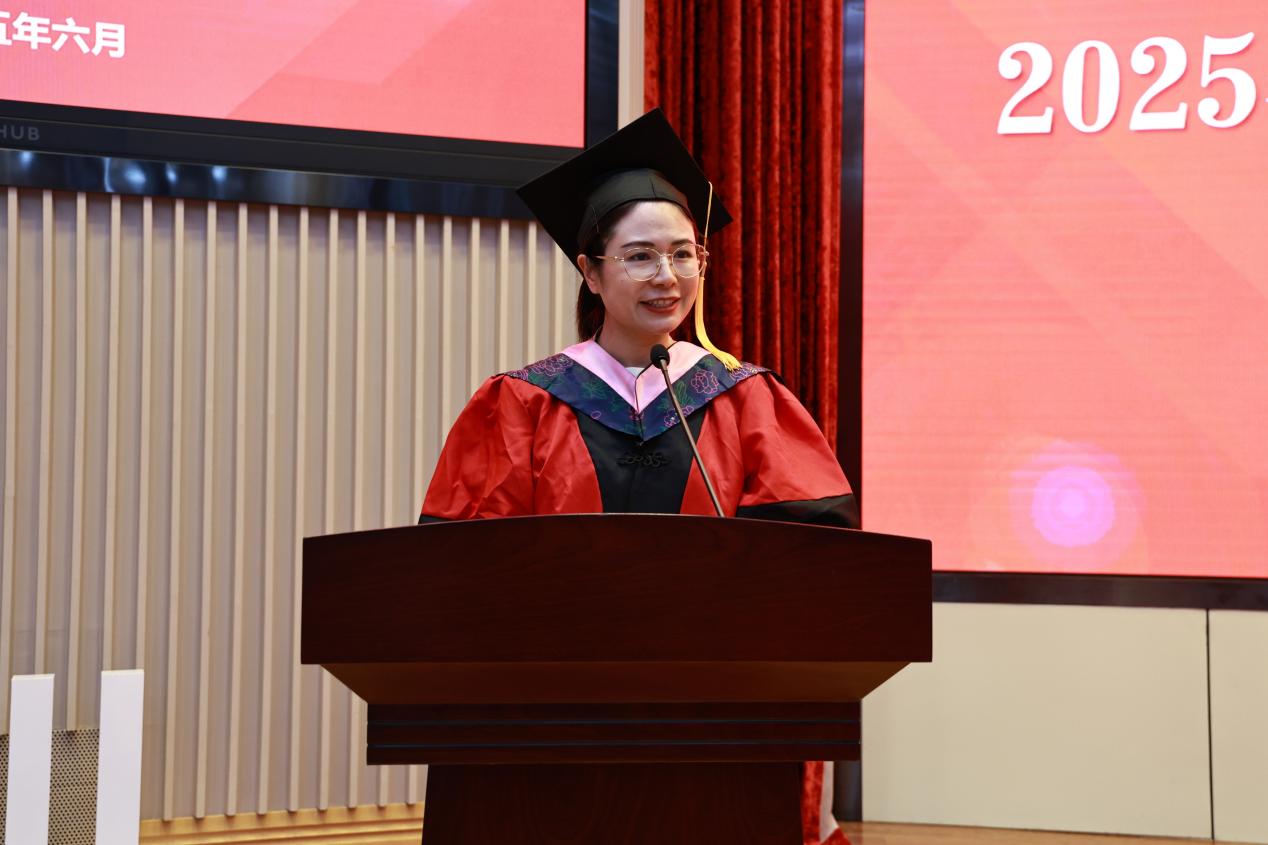 教师代表杨晓冬代表全体教师向毕业生们送上热烈祝贺,肯定了他们在大学期间的努力与成长。她回忆起自己毕业时的情景,感慨青春是一种心态,大学的“苦”是成长的甜蜜,而社会的“甜”中也有挑战,鼓励同学们把毕业当作新起点,勇敢面对未来职场、创业或学术道路上的挑战;坚信“人生没有白走的路,每一步都算数”。她希望同学们在充满不确定性的时代,要保持乐观和善良,不要被专业或现实限制,因为人生是马拉松,走得远的人是知道自己要去哪里的人。最后,杨晓冬深情寄语全体毕业生,母校永远是同学们的后盾,欢迎他们常回来看看,并祝愿同学们既有乘风破浪的勇气、也有笑对平凡的智慧,勇敢去书写属于自己的未来故事。