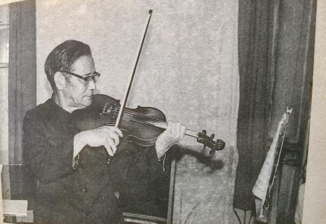 图为1987年病重期间,在哈尔滨医科大学附属第一医院病房每日坚持拉琴。