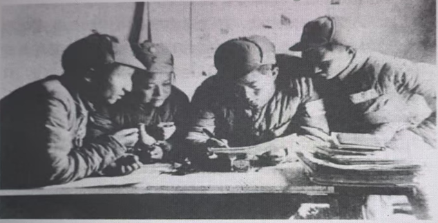 1946年春,大众日报记者编辑在临沂编辑部。 左起:辛冠洁、包慧、丁九、朱民