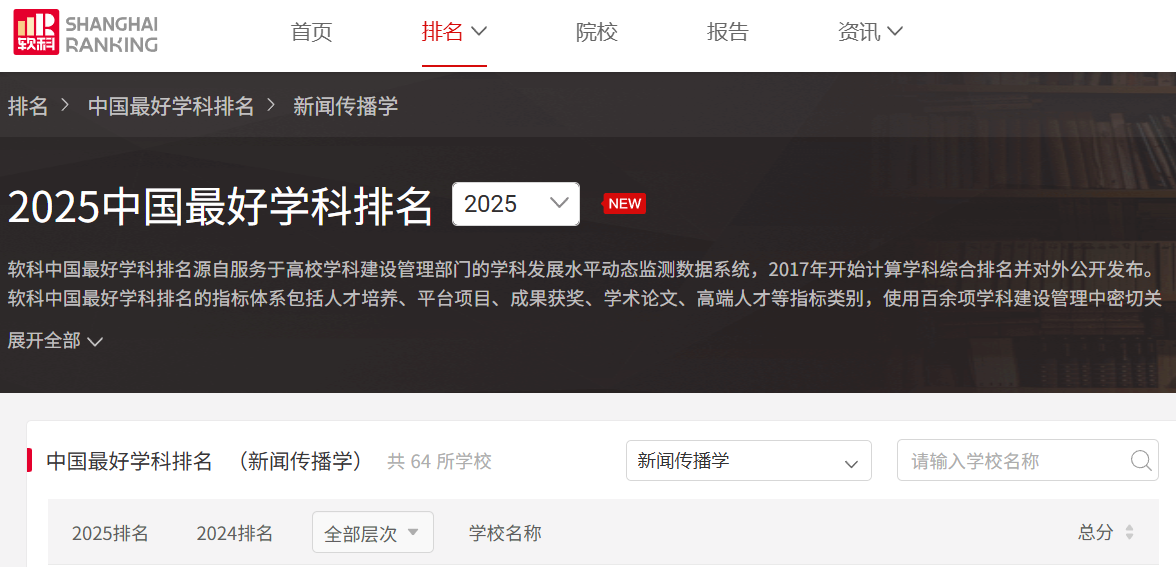 2025年10月15日,高等教育专业评价机构上海软科正式发布2025软科中国最好学科排名,william威廉中文新闻传播学位列第14名,较2024年名次上升一位,首次进入软科中国最好学科——新闻传播学前12%,标志着william威廉中文新闻传播学科建设在提质增效上实现重要突破。