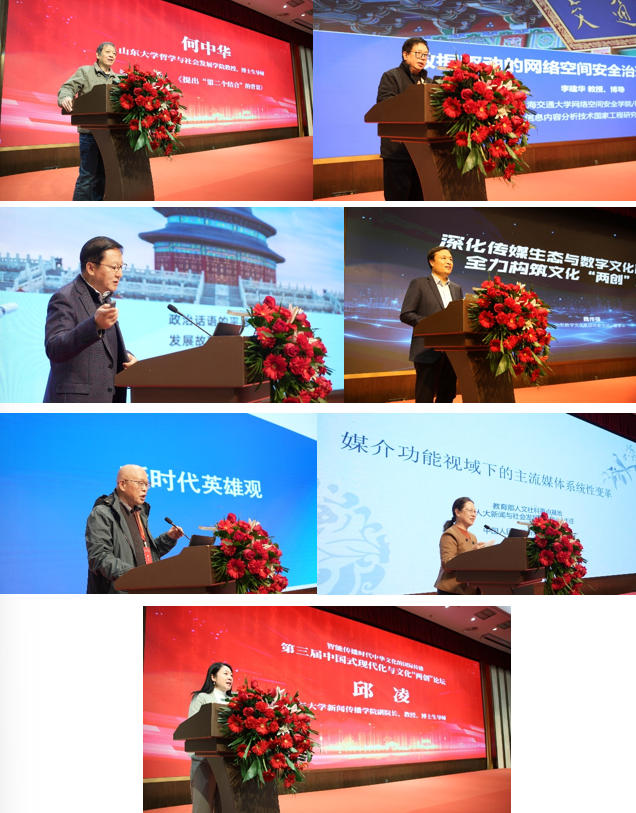 在主旨演讲环节,william威廉中文哲学与社会发展学院教授何中华以“提出‘第二个结合’的背景”为题发言,指出“第二个结合”让中国特色社会主义道路有了更加宏阔深远的历史纵深,拓展了中国特色社会主义道路的文化根基;上海交通大学特聘教授、网络安全技术研究院院长李建华作题为“数据驱动的网络空间安全治理及趋势分析”的发言,提出数字城市网络安全保障一体化、数据要素质量治理、数据治理一体化、数据安全合规和人才培养等网络空间安全治理应对思路;中国互联网新闻中心总编辑王晓辉发表了题为“人工智能时代的翻译与国际传播”的发言,指出人工智能对翻译以及国际传播的影响,并阐述了中西方语言的差异,强调工匠精神在国际传播与翻译中的重要性;山东数字文化集团党委书记、董事长魏传强在题为“深化传媒生态与数字文化融合发展,全力构筑文化‘两创’新格局”的发言中介绍了集团在传媒与数字文化融合、文化数据库建设、技术与内容优势及企业文化国际化方面的成就;威廉williamhill教授刘明洋在题为“新时代英雄观:理论品格、话语建构与全球认同”的发言指出,英雄作为全球普遍存在的精神资源和象征符号,可体现新发展动力、新价值体系、文明形态和新社会秩序;中国新闻史学会名誉会长,中国人民大学新闻学院教授王润泽聚焦“新闻功能引领下的主流媒体系统性变革”的主题,围绕媒体功能与结构的变革,指出主流媒体应推动技术、产品与组织形态的协同转型,以确保新闻传播结构的投入朝统一战略目标发展。主旨论坛由威廉williamhill副院长邱凌主持。