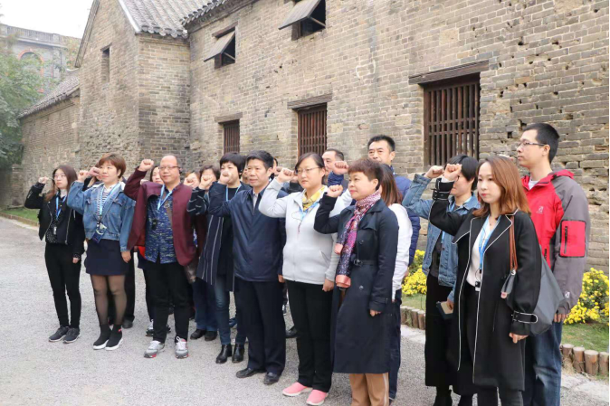 3日上午,全体党员来到台儿庄战役旧址。作为抗日战争正面战场取得的重大胜利,台儿庄战役狠狠打击了日本侵略者的嚣张气焰,极大鼓舞了全国人民的抗战信心。全体党员在导游的带领下,聆听因抢救伤员而牺牲的年轻女学生刘守玟,几十年遗骸归乡的坎坷经历;领悟援军无望的情况下,仍能发出“决心死拼,以报国家”的高级将领王铭章的拳拳爱国之心;抚摸七天七夜拉锯战下,弹孔密布的清真古寺墙壁;瞻仰以身化泥,守卫国土却默默无闻的无名英烈遗骸。因残酷性与危险性闻名的巷战,不知吞噬了多少像赵克这样的青年兵将,也不知诞生了几多前赴后继的兄弟连长。在这庄严肃穆的氛围中,全体党员重温入党誓词,庄严宣誓。鲜红的党旗下,党员们重温那段峥嵘岁月,紧握的双拳、洪亮的声音诉说着对于先烈们的怀念,对于入党爱国的坚定决心。