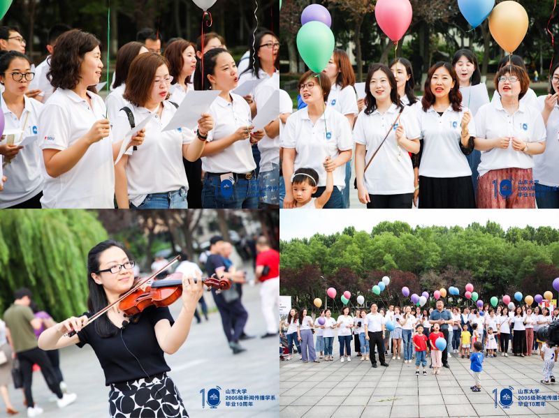 返校当天,校友们还组织了丰富多彩的纪念活动。校友们在邵逸夫科学馆前广场合唱了《山大校歌》,合影留念,并放飞承载着大家对母校美好愿望的彩色气球。之后校友们共进怀旧晚餐、表演节目并重游校园。