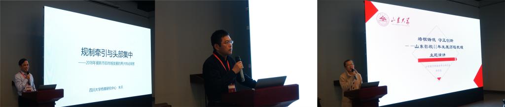 14点30分,大会进入主题演讲阶段,由倪万主持、各位影视业界精英进行经验分享。青岛东方影都融创产业园总裁孙恒勤以“青岛东方影都助力中国电影工业化发展”为主题发表演讲,阐述了东方影都致力于打造“科技+艺术”完整影视产业链、推动中国电影工业化发展的目标。大地院线创始人/董事、艾沃次时代执行董事方斌围绕“工业化”这个关键词,对“学习好莱坞,开创新时代”的主题展开探讨,点明中国影视工业化之路应师夷长技、厚积薄发。中影基地数字修复中心主任肖搏,以“‘中影·神思’人工智能图像处理系统—助力国产电影高质量发展案例分享”为题进行发言,展现出我国影视业已将人工智能应用在电影高分辨率处理、胶片修复、图像增强等方面的成就。Base-Fx副总裁高级助理、产教融合事业部总经理刘学的发言题目为“从影视后期产业看中国电影工业化之路”,他认为科学技术是电影工业的核心推动力,中国电影的发展关键在于后期工业化,并就如何实现电影工业化提出自己的见解。山影制作新媒体事业部总监李剑波从六个单元入手,对“培根铸魂,守正创新——山东影视41年发展历程梳理”展开演讲介绍。中国高等院校影视学会影视产业与管理专业委员会副主任委员、四川大学研究生院副院长、教授朱天的演讲主题为“规制牵引与头部集中--2018年国内视听节目市场的两大特征观察”,通过对传统媒体和互联网媒体的各类数据对比,提出三点待未来解答的问题思考。最后,中国高等院校影视学会影视产业与管理专业委员会副主任委员,南京艺术学院副院长、紫金文创研究院院长李向民总结发言强调,高校学者对影视业的研究不应仅停留在学术层面,更应进入企业深入了解行业发展动向,加强学界和业界的互动才能使影视业的未来更加光明。