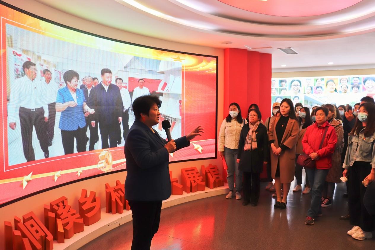 三涧溪村党史资源丰富,习近平总书记曾在2018年到该村调研,了解该村以党建为统领,推动乡村振兴的情况。师生党员代表到达三涧溪村后受到了村党委书记高淑贞的热情接待。她与村委主要成员一起带领大家重走习近平总书记的视察路线:在党群服务中心,她站在宣传板前详细介绍了三涧溪村因人心涣散由富入贫,又在新任村党委的集中领导下脱贫致富的曲折历程,强调了以党建为核心,高度统一思想的必要性;在乡村振兴展馆,她面向大屏幕回忆了总书记视察时的点点滴滴,说明了读懂落实党的方针政策,持之以恒不断学习的重要性。她勉励大家守初心、有恒心、定信心,勇担时代重任,在生活实践中以“为民服务孺子牛、创新发展拓荒牛、艰苦奋斗老黄牛”的“三牛精神”为指导,做国家与社会发展中不可或缺的时代新人。她的鼓励化作党员们的阵阵掌声,三涧溪村充满干劲的党建文化已在大家全神贯注的倾听中入耳入心。