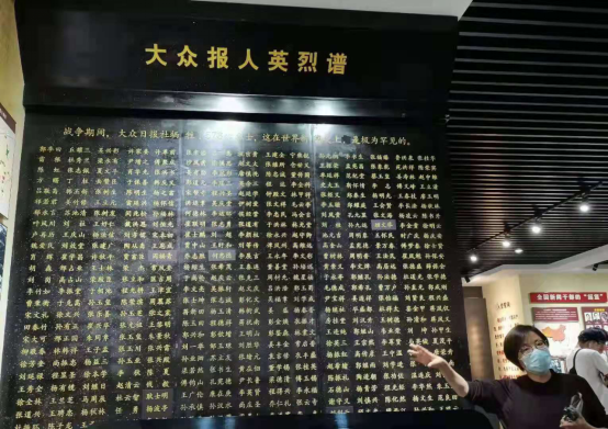 在参观陈列馆中,最引人注目的是一面黑底金字的大众报人英烈谱。那上面镌刻了578位烈士的姓名,其中有17位战地记者,无一例外均是在战场上牺牲,还有因打鬼子牺牲的印刷工人。而其中最大量的就是战邮员,共有468位。“战邮员太苦了!”于馆长感慨道,“他们的工作是负责站与站间邮件的运送,每天他们背上行囊——这里面装着急需他们送达的20斤邮件、1支长枪、3棵手雷,还有一些食物与换洗衣服——大概四十多斤的物品,就这样走一夜——120里,走到需要送达邮件的站点后交接、休息;等到第二个夜晚来临,战邮员再背上从这个站点需要送达的文件原路返回。这样一次工作才算完成,二百四十里,全靠步行。”就在这样艰苦的条件下,许多战邮员都因为过度劳累或患病而牺牲。听到这里,同学们都沉默了,战邮员这种不怕辛劳的精神深深地撼动了每位师生的心灵。