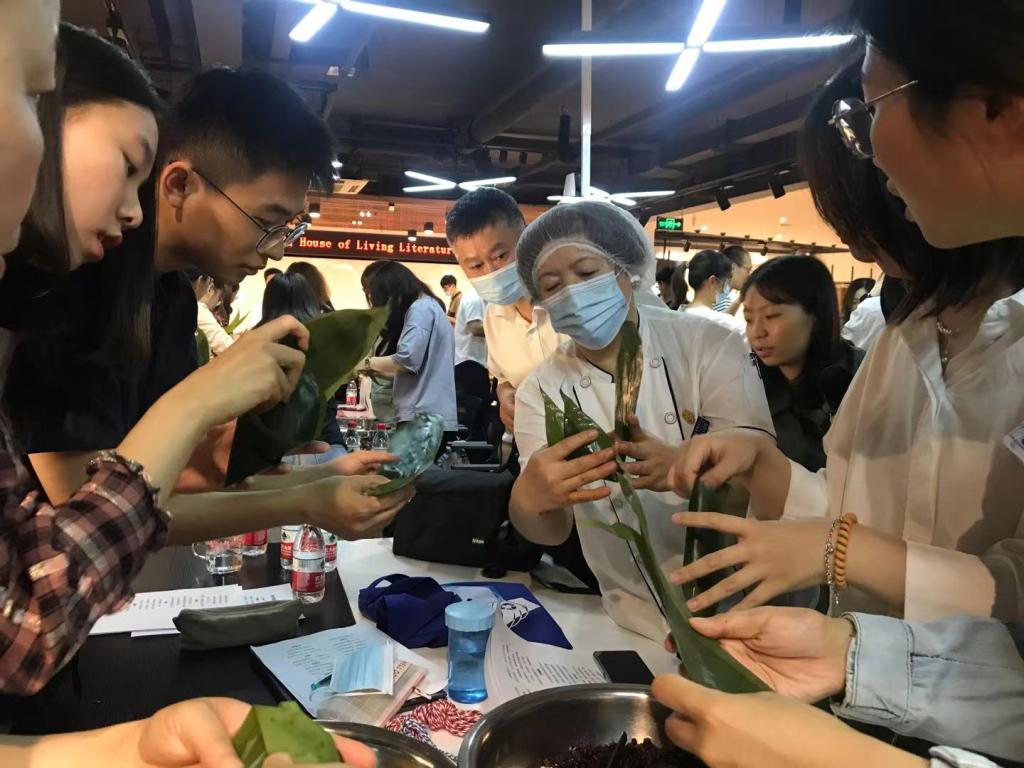 随后活动在齐园餐厅一多食堂主任来京、周秀芹师傅及多名食堂员工的技术指导下开展。首先,周师傅详细介绍了包粽子的具体制作工艺、馅料搭配,并现场演示了粽子的包制方法。各党支部分组开展活动,大家一边学习包粽子,一边讨论着端午的民族风俗,现场其乐融融,粽香四溢。