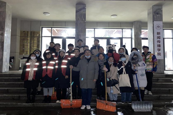 学院团委负责人、辅导员杨璐和同学们一起参与工作,大家手握扫雪专用的铁锹将道路中央的积雪和冰块转移到两侧不妨碍通行的位置。尽管天寒地冻,但大家齐心协力,干的热火朝天,气氛热烈。