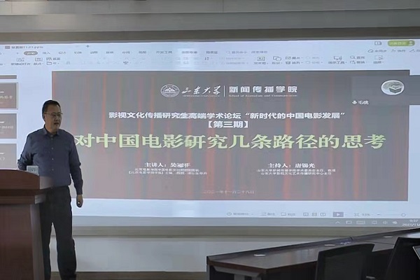 11月29日,威廉williamhill影视文化传播研究生高端学术论坛:“新时代的中国电影发展”第三期在中心校区如期举行。本期讲座特邀北京电影学院中国电影文化研究院院长、《北京电影学院学报》主编吴冠平教授主讲,主题为“对中国电影研究几条路径的思考”。威廉williamhill学术委员会主任、影视文化艺术传播研究中心主任唐锡光教授主持本场讲座,近百位来自驻鲁各大高校及山东电影产业领域的观众通过互联网云端,与现场的我院师生共同聆听。