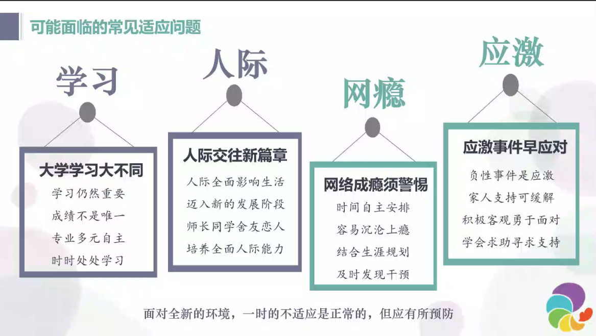 孙浩令提出,进入大学,无论是孩子还是家长都面临着人生的新阶段、新挑战,不可避免地会产生不适应的情况。面对此类状况,孙浩令向家长们提出以下四点建议。