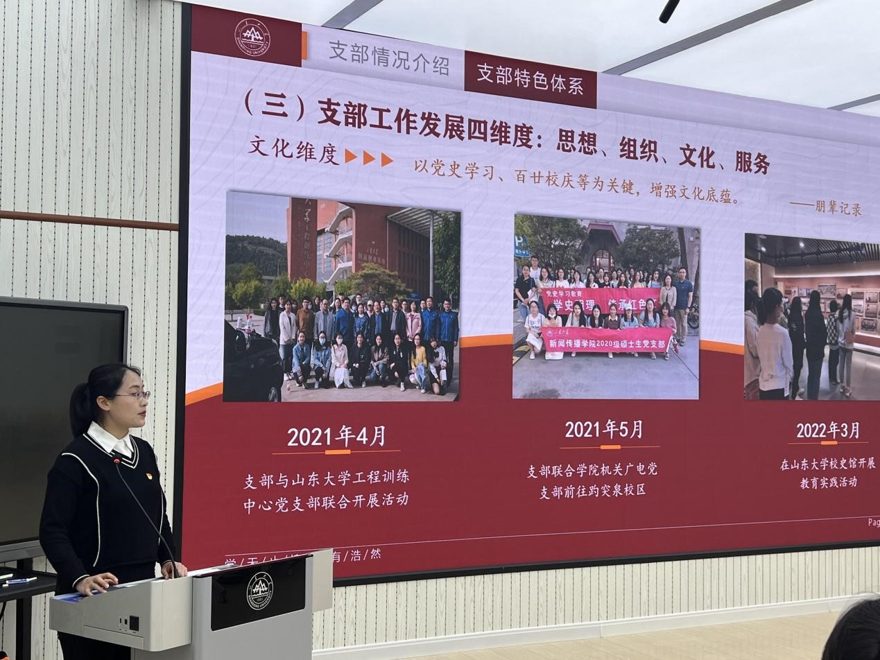 课程伊始,学院2020级硕士生党支部书记戴永洁以“心中有党坚定方向”为主题,从思想、组织、文化、服务四个维度分享了所在党支部党员管理、支委发展、支部实践的工作经验,并对支部“党”字型支部建设体系与“新薪朋辈”党员教育板块两大特色体系展开详细讲解。