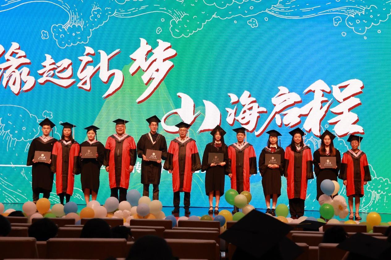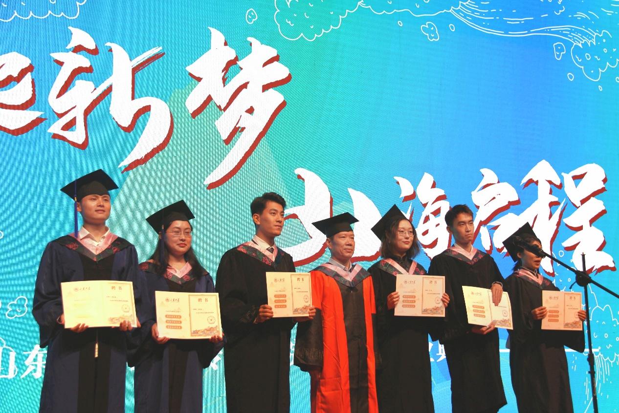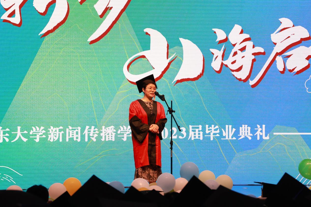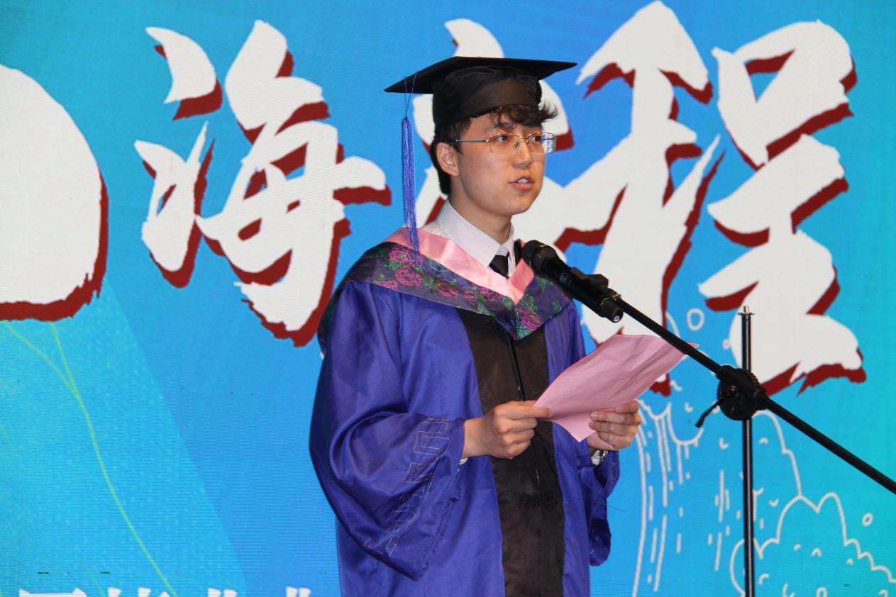 随后,毕业生代表登台发言。研究生毕业生代表李泳志代表所有同学向学校和学院三年悉心培育表达感谢,并表示,山大岁月提供了无限的可能和机遇,未来将会带着老师们的殷切嘱托和美好祝愿,牢记山大学子的精神,做不负时代和不负青春的栋梁之才。