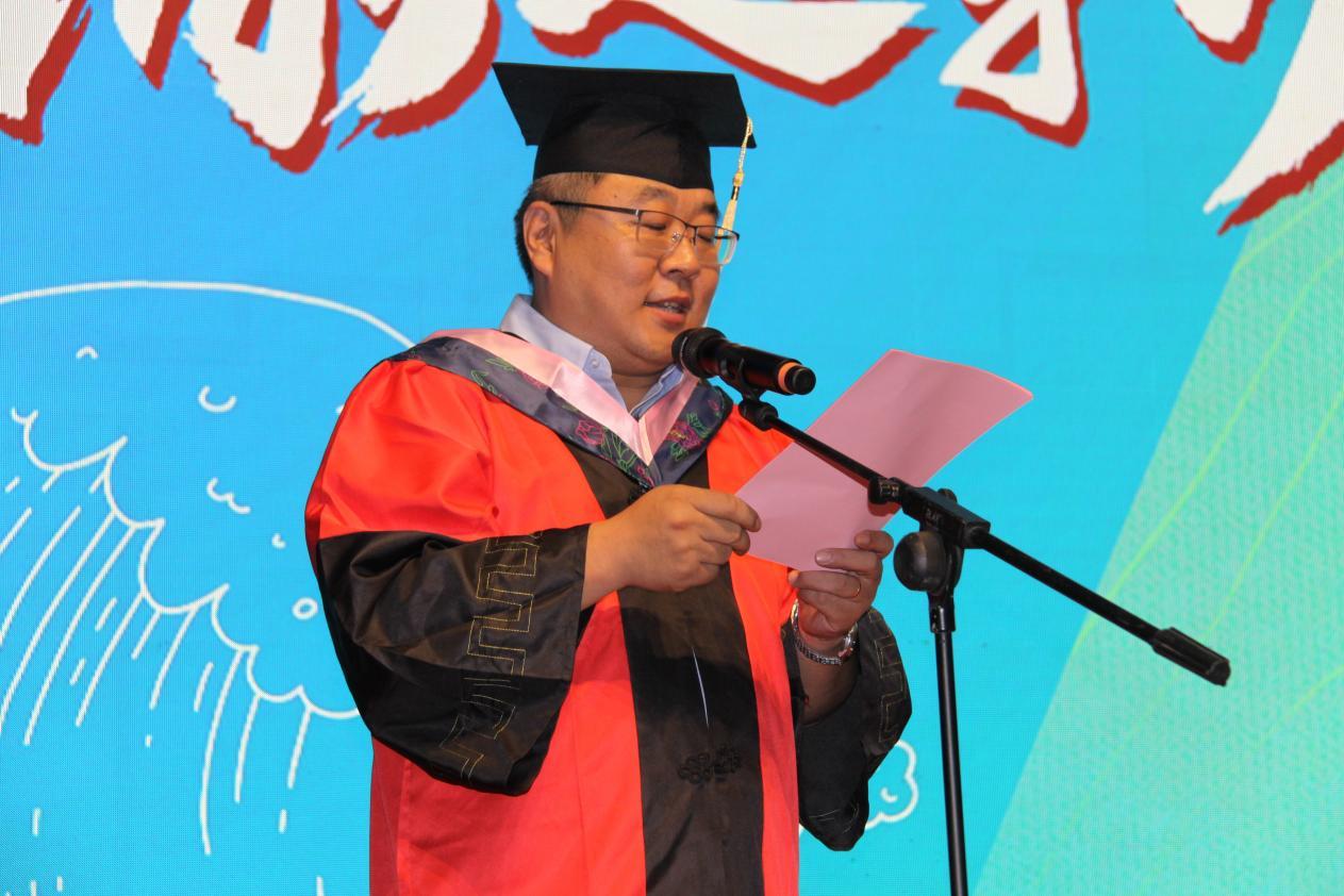 随后,院长刘明洋向毕业生致辞,为毕业生上在校的“最后一课”。刘明洋送给毕业生三句话:一是要保持理性,世界正在发生深刻变革,保持理性思考,学会深刻洞察才能不断提高自己的认识;二是要努力奉献,在社会的不断进步中留下自己的影子,实现自己的价值,无愧于我们的时代;三是要学会宽容,宽容是一种优秀品质,要学会宽容他人,在相互尊重与宽容中汇聚起团结的力量,要学会宽容自己,保持快乐的心境面对生活的方方面面。刘明洋院长对同学们的付出与奉献表示感谢,对学院的发展表示自豪。最后,他祝愿所有毕业生前程似锦,希望同学们常回家看看。