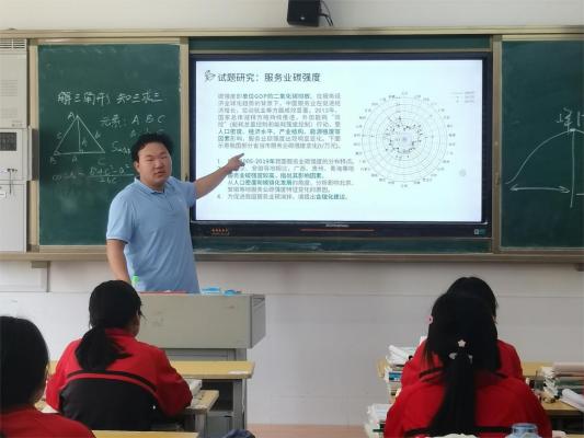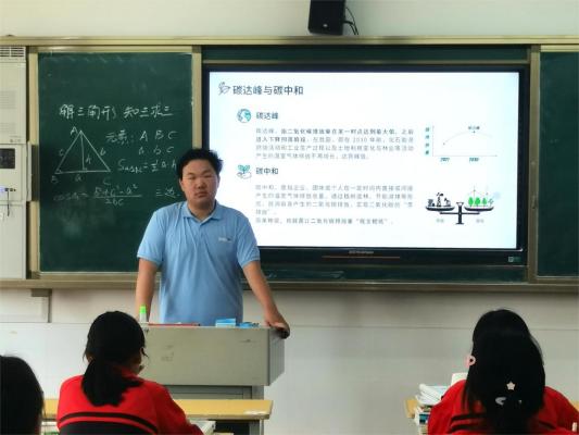 接下来,尹天佑从学生自身出发,向学生们普及了低碳生活的常见方式。尹天佑从“衣”“食”“住”“行”四个角度展开讲解,号召同学们在日常生活中做到一水多用、废纸再利用、合理使用空调电器等低碳生活方式,为低碳生活的推广和“双碳”的推进做出贡献。特别地,尹天佑结合最新学情考情,为同学们展示了以“双碳”和低碳生活为背景的题目,并对其中的地理试题进行了详细讲解,体现了“用课本知识解决实际情境问题”的教学思维,进一步提升了同学们的学科素养。