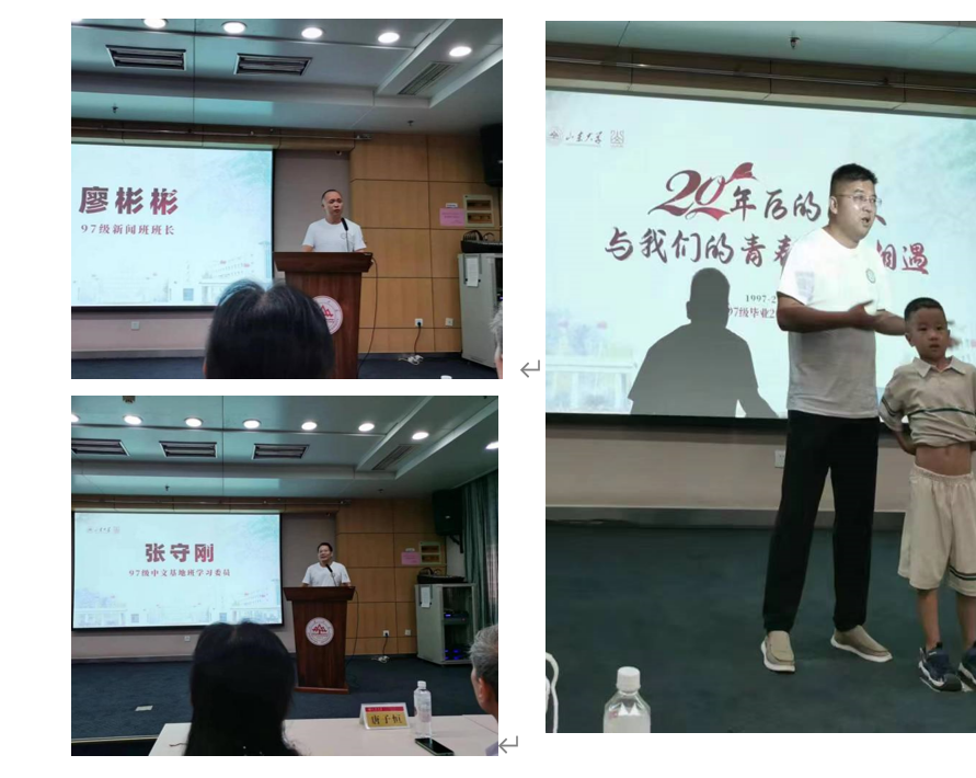 在同学代表发言环节中,97级新闻班班长廖彬彬回顾过去,畅谈未来。在感叹母校日新月异的发展变化的同时,他表示今后将进一步加强与母校的联系,继续关心和支持母校的建设发展,为母校的高质量发展贡献力量;97级中文基地卫生委员张守刚分享了自己的职业历程,他从自身经历出发,倡议大家保持新鲜感、保持表现欲、保持表达力;97级校友王千马表达了对20年同学情的珍惜,感叹同学重聚的温馨,并对母校和恩师表示了真诚的感谢。