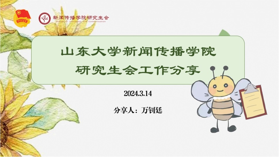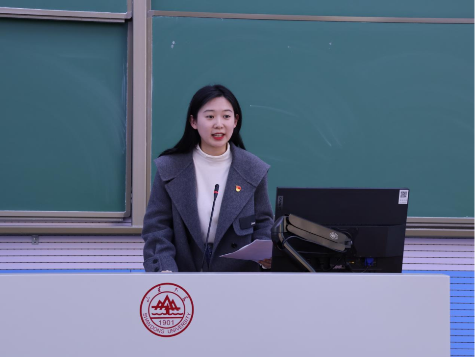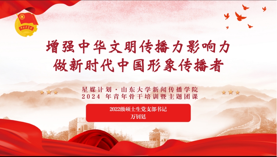 2022级硕士生党支部书记万钊廷进行了《增强中华文明传播力影响力,做新时代中国形象传播者》主题宣讲。万钊廷从中华文明的历史性和现代性出发,从具体的国际传播实例着眼,讲解了国际传播的目前形势和方法论。万钊廷呼吁,要立足国情、放眼世界,主动讲好中国共产党治国理政的故事、中国人民奋斗圆梦的故事、中国坚持和平发展、合作共赢的故事,持续增强国际传播能力,提高国际话语权,增强中华文明传播力与影响力。身为新闻传播专业的学生,在校内讲好山大故事,在校外讲好中国故事,是我们义不容辞的责任。