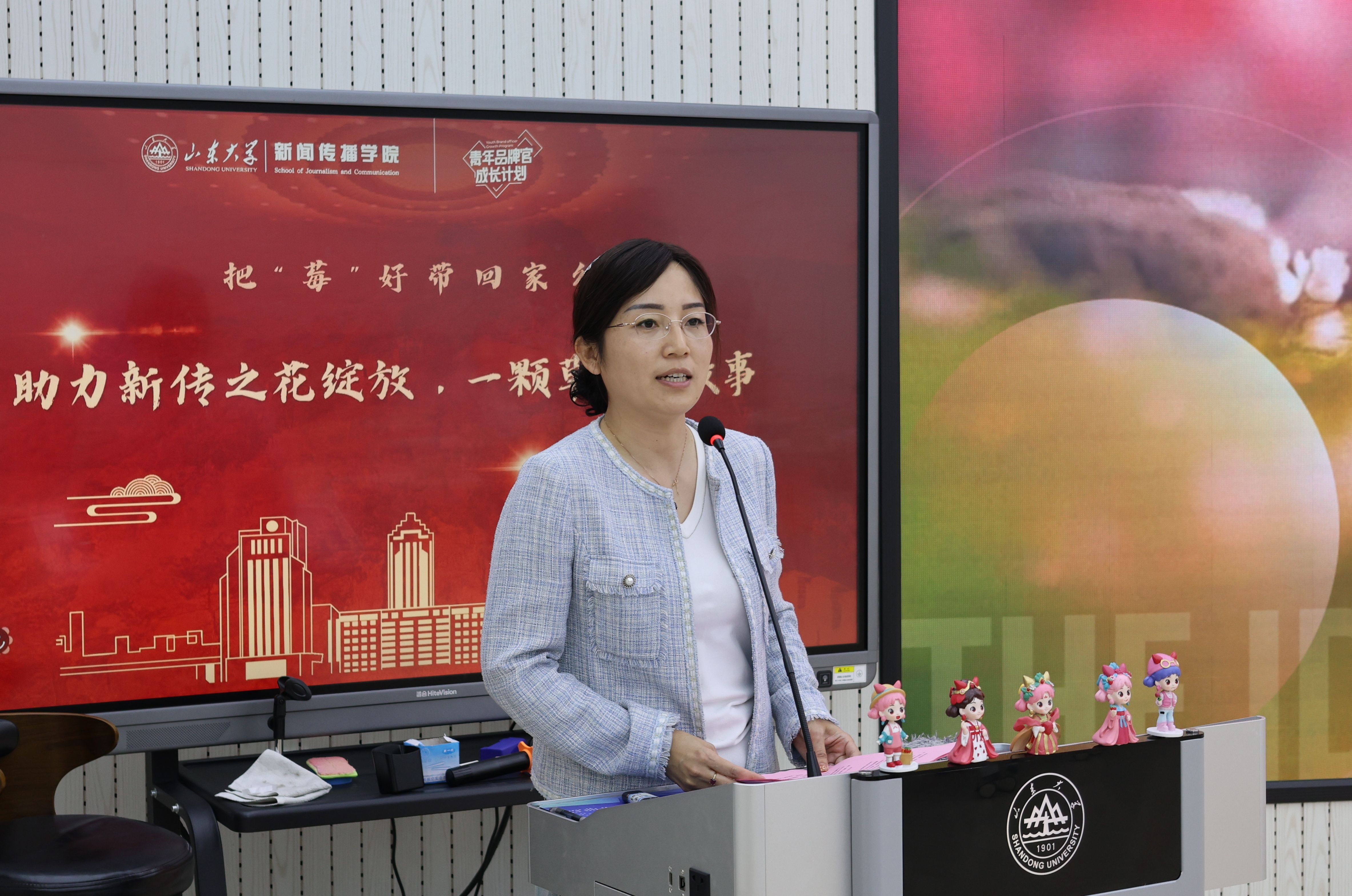 在“助力新传之花绽放”校友企业家分享环节,山东省草莓协会秘书长、济南市农业产业协会副会长、山东泉心农业科技发展有限公司总经理刘莹以“一颗草莓的故事”为青年师生进行了主题分享。刘莹从乘风起航、落地执行、未来可期三个方面出发,介绍了标准化、品质化、品牌化、数字化的草莓智慧农业。泉心农业通过发展草莓产业,与农民合作共赢,改善了当地老百姓的生活。她表示,面对农业市场发展的挑战,泉心农业当回归核心需求,以优质农产品为核心,打造品质高、口感好、有安全的草莓品牌,并关注产地服务,让好的土地种出好的果子。未来将覆盖1万亩草莓种植,进一步打造“莓妃”品牌,通过农业科技、智慧赋能、供应链等方式,打造差异化的农产品IP。最后,刘莹希望广大学子积极投身乡村振兴,在祖国的土地上发挥价值。