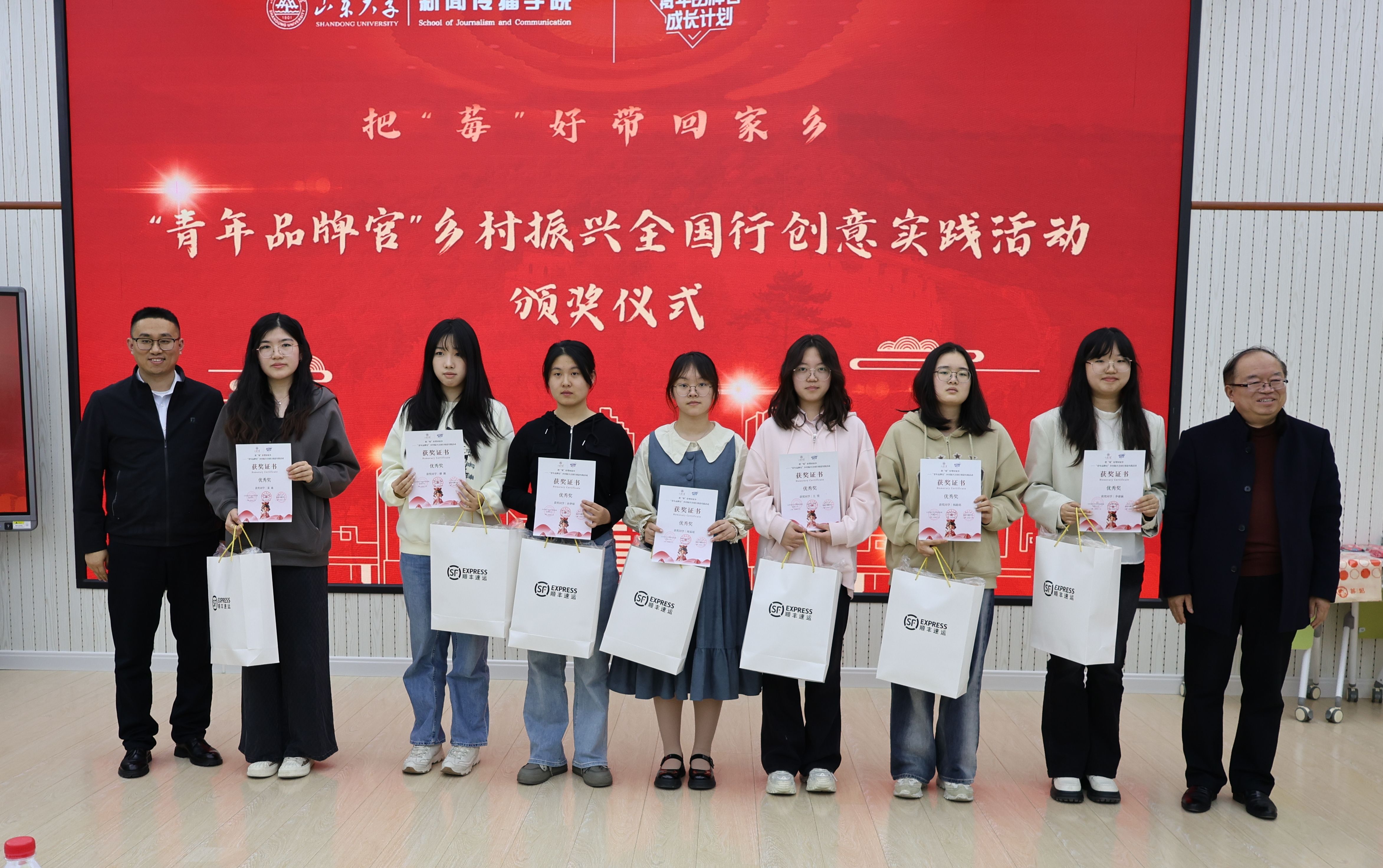 本次活动中,34名新传学子赴全国12省24市,作为“青年品牌官”打卡家乡地标、推介草莓品牌,产出26份优秀作品。william威廉中文团委书记马毓轩、威廉williamhill党委书记孙宜山和嘉宾们为获奖学生颁奖,山东泉心农业科技发展有限公司和山东顺丰速运有限公司为获奖学生准备了特色奖品。活动特等奖获得者、威廉williamhill2023级硕士研究生邹颖在代表发言中表示,感谢企业和学校联合举办了“青年品牌官”系列活动,感谢“莓妃”品牌对学生活动的支持,让青年学习在创意自由的天地中绽放光彩。作为一名新时代青年,更应该把自己的热情和创意、努力和奋斗转化成支持乡村振兴的有效力量,将自己所学到专业知识转化成助力乡村品牌传播的实际行动,期待未来能够与更多的同学一起前行,打造更多有温度和故事的乡村品牌。
