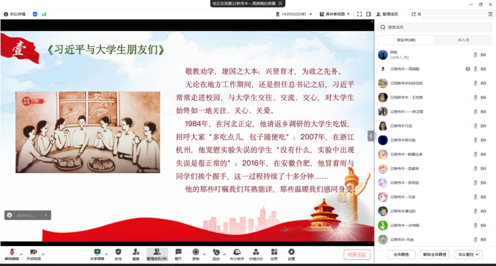 2022级本科1班团支部组织同学们前期自行阅读书籍《习近平与大学生朋友们》,并开展线上读书会对作品进行讲解与阅读感悟分享,通过对习近平总书记的思想进行深入学习讨论,真正做到让学习入脑入耳入心;