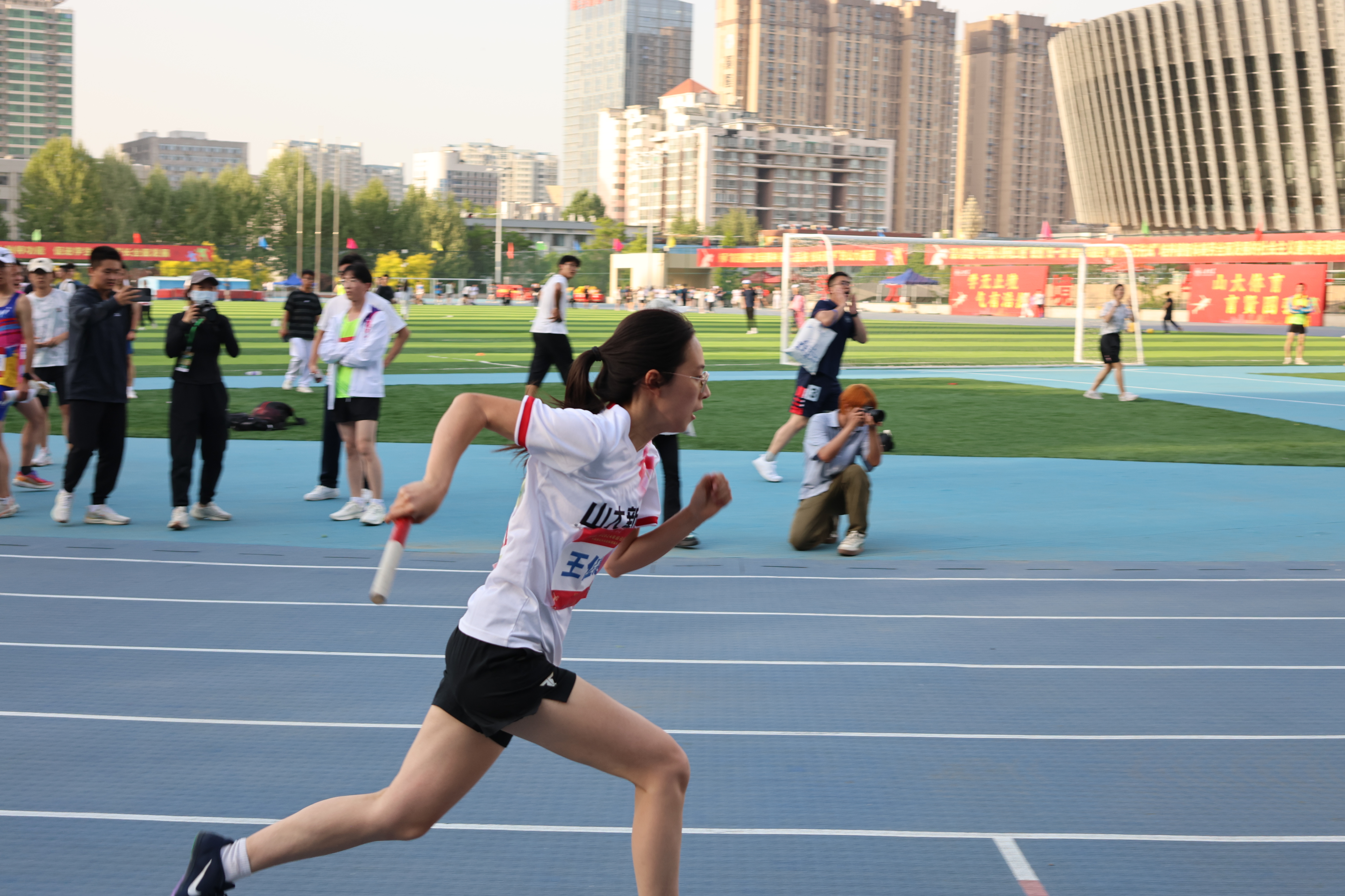 在首日佳绩的鼓舞下,运动员士气高涨,全院上下团结一心。迎着晨光,普姆阿日获得女子100米栏第七名,拉开了第二比赛日的序幕。王帅在男子组5000米中跑出第九名,王佳慧在女子组5000米比赛中夺得季军,李若荃、张琳榆在女子三级跳中分别跳出季军、第四名的好成绩。最激动人心的是整场运动会的收官战——4×400米接力。男子接力队勇于自我突破,取得小组第六;女子接力队则表现出了出色的竞技能力,王佳慧在首圈即以极快的速度拉出无人区,保证后续交接棒的顺利进行;李斯羽和李若荃继续保持优势,和同组第二名拉开接近三十米的差距;决胜圈张弛凭借强大的爆发力将差距拉大到五十米左右,最终以优异成绩取得冠军。