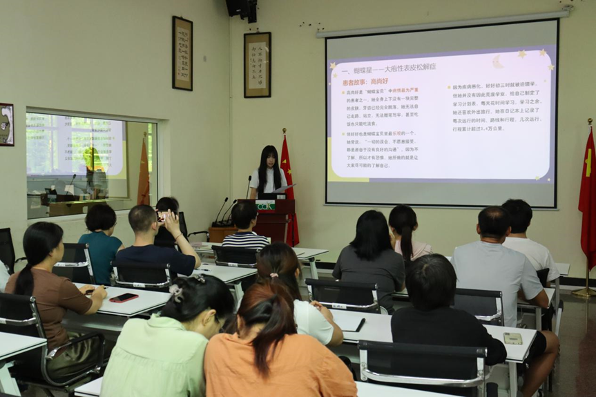 此次宣讲中,廖薇首先通过对大疱性表皮松懈症、苯丙酮尿症和成骨不全症三类罕见病的临床症状和发病机理的讲述,向居民们介绍了罕见病具体类型和表现,并借助现实中罕见病患者的积极向上的人生故事,传达他们内心坚定的力量;接着,通过科普罕见病的概念、分类和特点,增强了居民群众对于罕见病专业性知识的认识。虽然罕见病暂无根治的医学方法,但爱与理解是种魔法,本堂课也呼吁大家在生活中用“爱与理解”去对待罕见病患者,摒弃偏见与歧视,让罕见病群体的声音被更多人听见,真正实现“让罕见被看见”的目标。