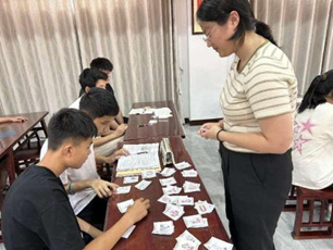 在团队成员许斯雅的引导下,孩子们化身为“小小文字侦探”。他们仔细观察甲骨文卡牌上的象形图画,尝试解读其意义,并猜测对应的现代汉字,这一过程激发了孩子们学习甲骨文的兴趣。随后,孩子们分组合作,寻找与甲骨文卡牌内容相匹配的现代汉字,进一步加深了对甲骨文及其演变过程的理解,同时也巩固了对汉字演变历程的认识。