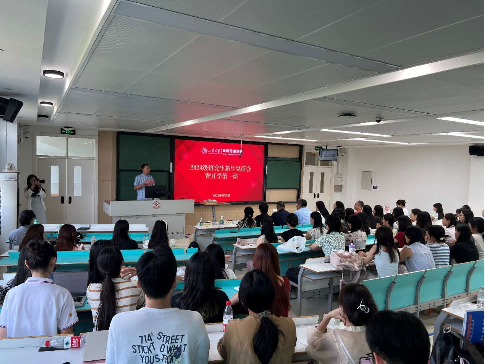 活动共分为两个部分,第一部分为新生欢迎仪式。首先由研究生导师代表戴元初致辞,戴元初代表学院对新生表示热烈欢迎,并指出研究生阶段是生命历程的重要转折点,这一阶段不仅意味着从本科时期的绩点导向转为自我发现导向,更意味着自我修炼与成长。戴元初强调,研究生阶段要强化对独立研究的追求、批判思维的锤炼以及投入研究领域的自我期待。他鼓励新生设立明确的研究目标,构建自我的研究关系网络,并注重时间管理,不断提高学术效率。此外,戴元初建议研究生应具备超越校园的开阔视野,不仅要为未来职业生涯做预设,也要为终身学习预留空间。他勉励新生在这个迅速变化的时代中“从容地感受,放肆地实践”,勇敢迎接挑战,书写人生新篇章。