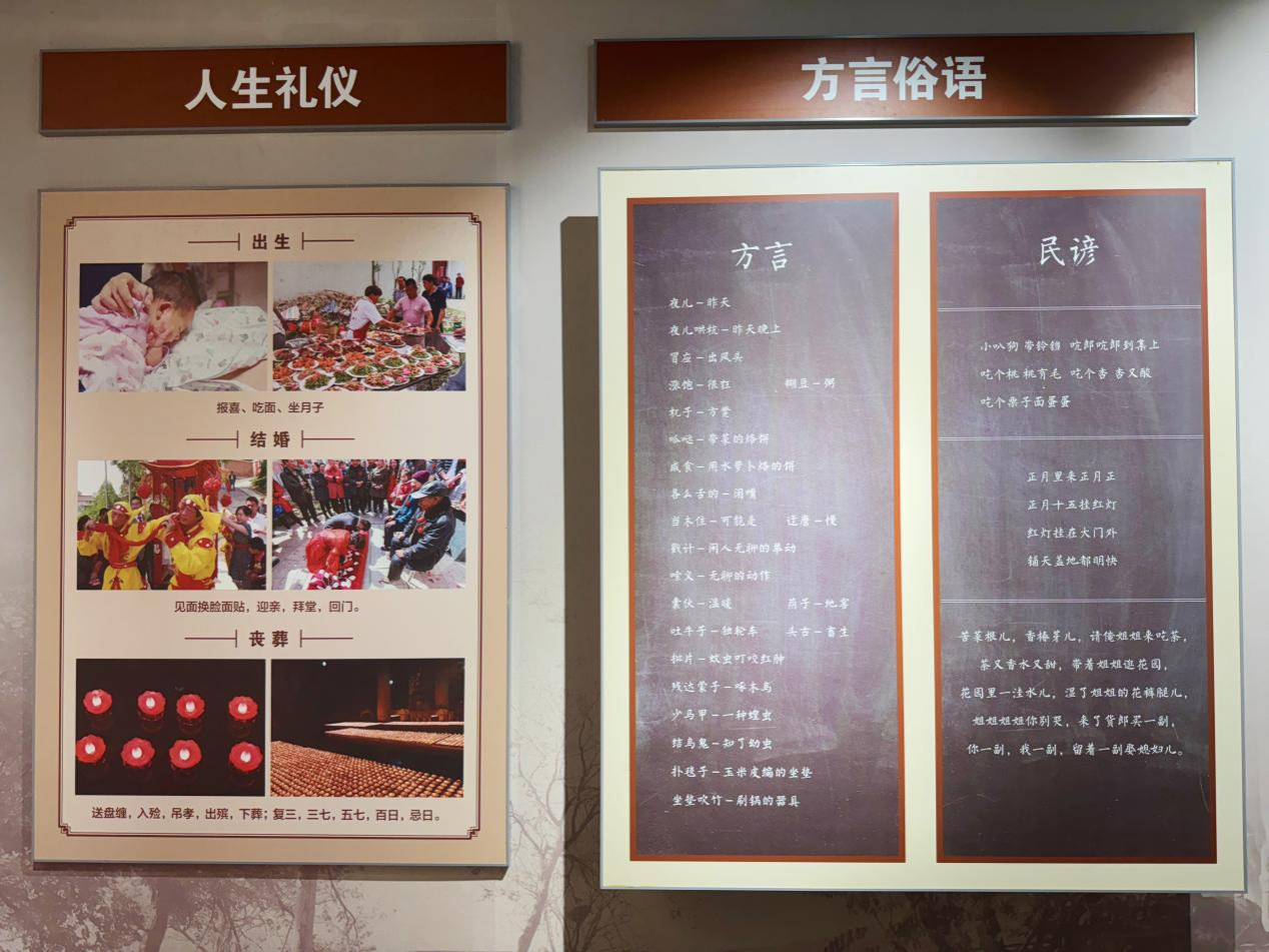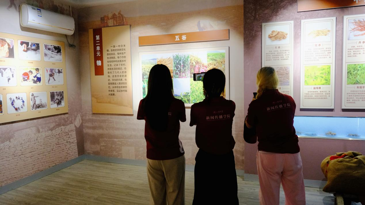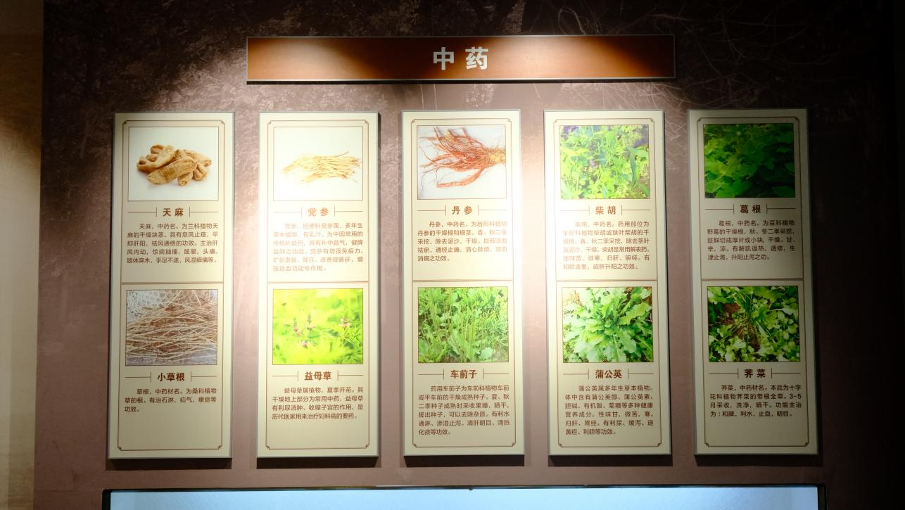 作为大峰山抗日根据地核心村,南黄崖村保留着丰富的革命遗产。团队首站来到红色南黄崖村史馆,这里不仅是革命历史的陈列室,更是农耕文明的博物馆。展馆以“红色沃土·薪火相传”为主题,分设四大特色展区。农具展区陈列着抗战时期使用的犁耙、纺车等老物件,见证了军民大生产时期的奋斗岁月;五谷展区通过展示实物与图文讲解相结合的方式,讲述当地特色作物如何在战时保障军民供给;中药展区则展示村民采集中草药救治伤员的故事,体现了“红医精神”的传承;礼仪展区还原传统婚俗和节庆场景,呈现革命老区人民的文化根脉。“一架纺车、一筐谷穗,都是军民鱼水情的见证。”团队成员触摸着斑驳的农具,仿佛回到那段“自己动手、丰衣足食”的峥嵘岁月。
