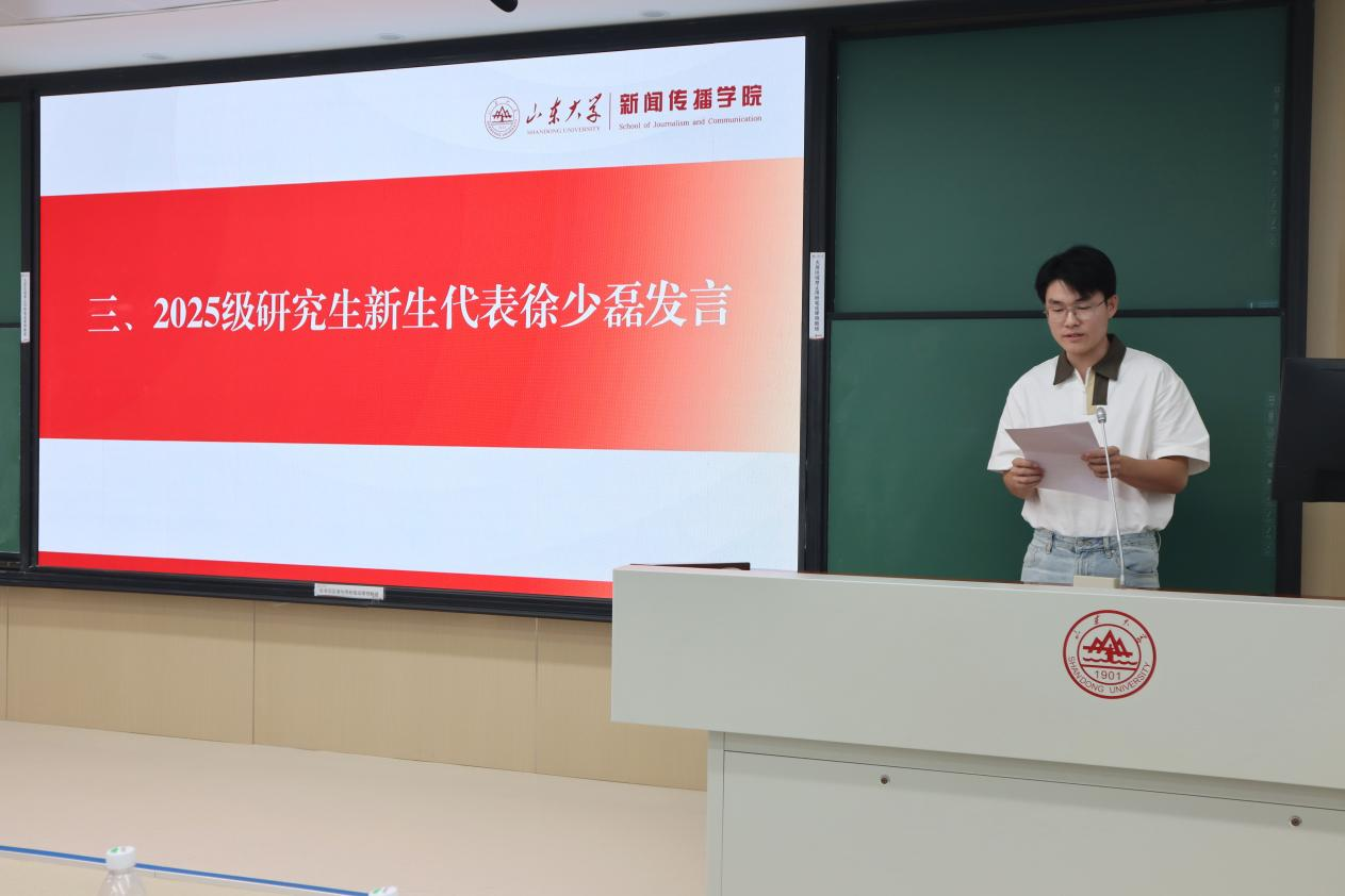 2025级研究生新生代表徐少磊以“扎根”“破圈”“生长”为关键词表达了同学们要以新闻人的敏锐捕捉时代脉动,以传播者的智慧打破学科壁垒,让山大的求学时光成为拓展同学们认知边界的崭新起点。