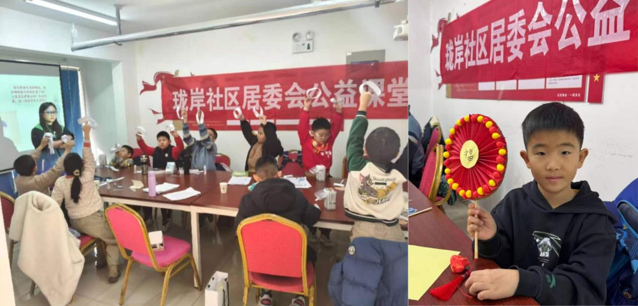 创作环节欢乐又热闹,孩子们拿起五彩黏土,尽情地揉、搓、压、捏,小小的黏土在指尖灵活变幻,有的塑造成灵动可爱的花草;有的做出别致精巧的文字纹样;还有的搭配出清新童趣的图案,再小心翼翼粘贴在团扇扇面之上。志愿者们在课堂中巡回指导,耐心解答每一个疑问,细心帮助孩子们解决制作中的小难题,教室里充满欢声笑语,创意与温暖在指尖不断绽放。