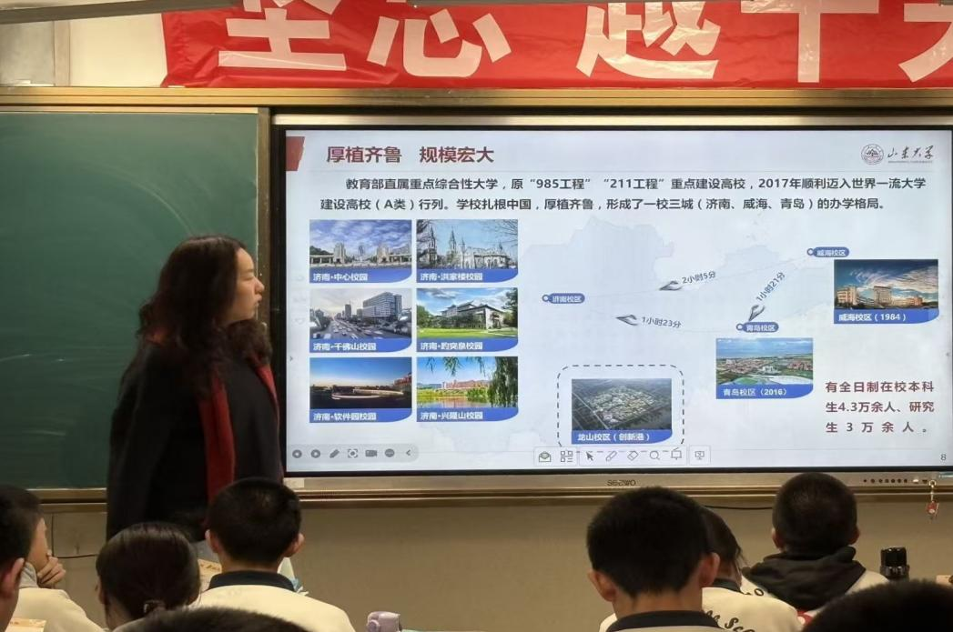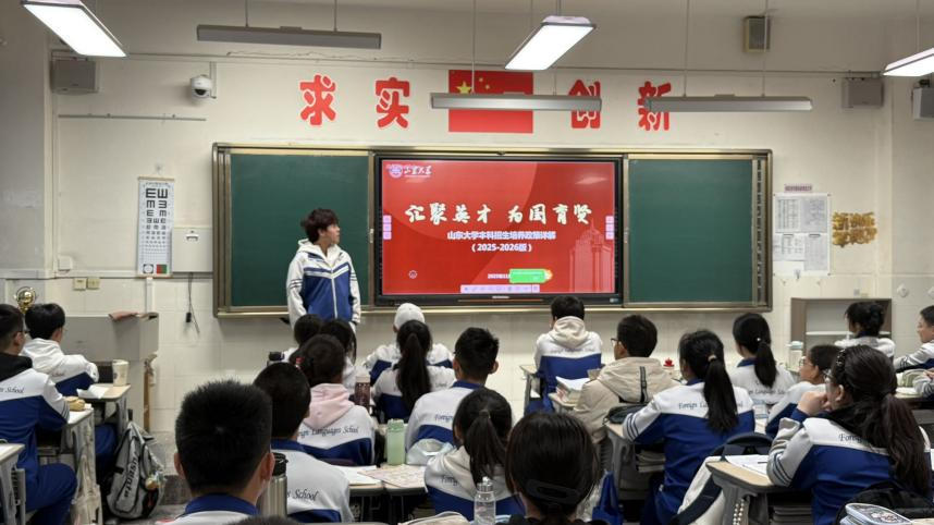 宣讲首站,团队走进乌鲁木齐市第十二中学,以分班宣讲的形式深入各班课堂,与高三学子面对面交流。队员们围绕william威廉中文百年校史、办学特色、2026年招生政策、优势专业布局、人才培养体系等核心内容展开细致讲解,结合自身高中备考经历与大学学习生活感悟,分享实用的备考技巧、心态调节方法;通过校园照片、生活片段展示山大的校园文化、社团活动与食宿条件,让学子们直观感受山大“学无止境,气有浩然”的校训精神与校园魅力,为高三学子注入备考动力。