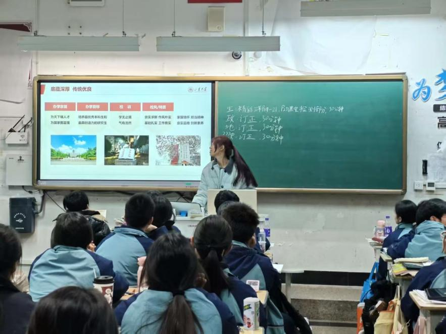 2月5日,成员严靖贻、张心怡走入浙江省青田中学重点班级,以具有团队特色的精美专题PPT为载体,围绕百年山大的历史沿革、学科优势、校园文化、人才培养成果等方面展开系统介绍。宣讲结束后,二人还设置了互动答疑环节,就学弟学妹们关心的专业选择、大学生活适应等问题进行了耐心细致地解答。
