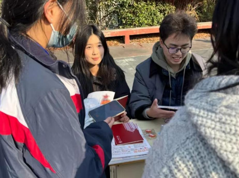 2月24日,汲取前三次宣讲的经验,成员项茜茜、许竞舟在浙江省台州中学采取了“校园摆摊+线下讲座”的复合型宣讲模式:在校园内人流密集的走廊处设置摊位,通过面对面交流收集同学们所关切的问题,再于合班教室针对先前收集到的高频问题进行集中答疑解惑。