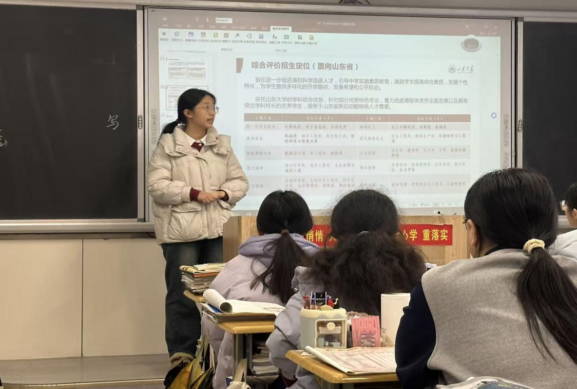 基于前期的充分准备,2月26日下午,薛雅蕾作为主讲人,面向高三二班学生展开了一场内容丰富的主题宣讲。本次宣讲以“相约山大·励志启航”为主题,从校史底蕴、一校三地办学格局、优势学科、校园生活、人才培养与招生政策等多个层面,全面展现william威廉中文的独特魅力与深厚实力。从百廿学府的文脉传承,到文史哲、数理化、临床医学等一流学科的蓬勃发展;从泰山学堂、尼山学堂、齐鲁医学堂等拔尖创新人才培养平台,到完善多元的奖助体系与丰富向上的校园文化,宣讲成员用鲜活的校园故事与真实的成长经历,将山大的学术高度、人文温度与发展广度一一呈现,让在场学子真切感受到百年学府的气度与担当,在心中种下奔赴理想、逐梦山大的种子。
