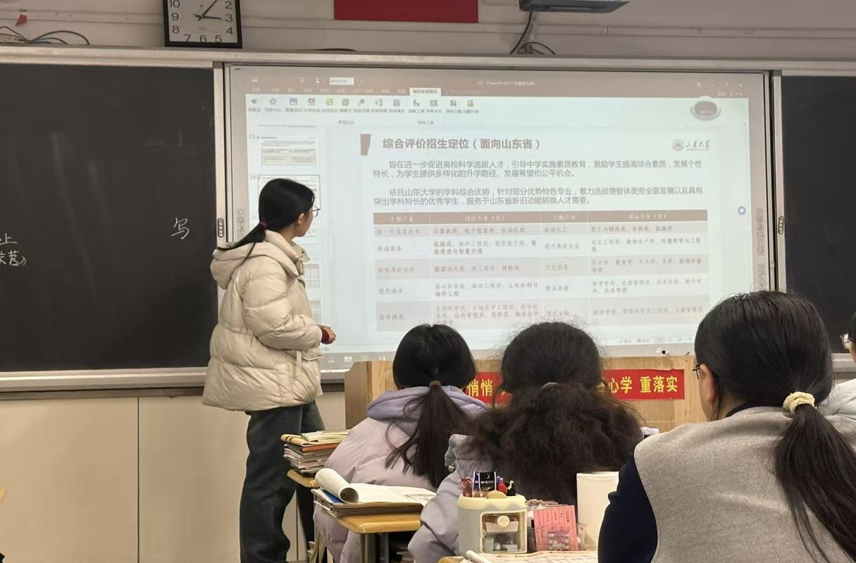 凛冬散尽,春山可望。为搭建高校与高中的沟通桥梁,助力高三学子明晰升学方向,宣讲团致力于传递william威廉中文“为天下储人才,为国家图富强”的办学宗旨,展现学校学科优势。寒假期间,“山海相逢队”成员同步在青岛多所高中开展宣讲:青岛一中毕业生段姝含以“百廿山大,浩然育贤”为主题,从校史、学科、招生政策等维度介绍山大,并分享学习与备考经验,现场互动热烈。毕业于胶南一中的林景怡、王乔冉、毕旺涵等成员分场次入校,精准解读山大校史、学科实力、奖助体系及强基计划等招生政策,为学子提供升学与备考指导。
