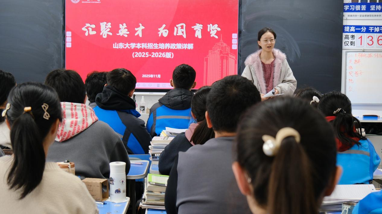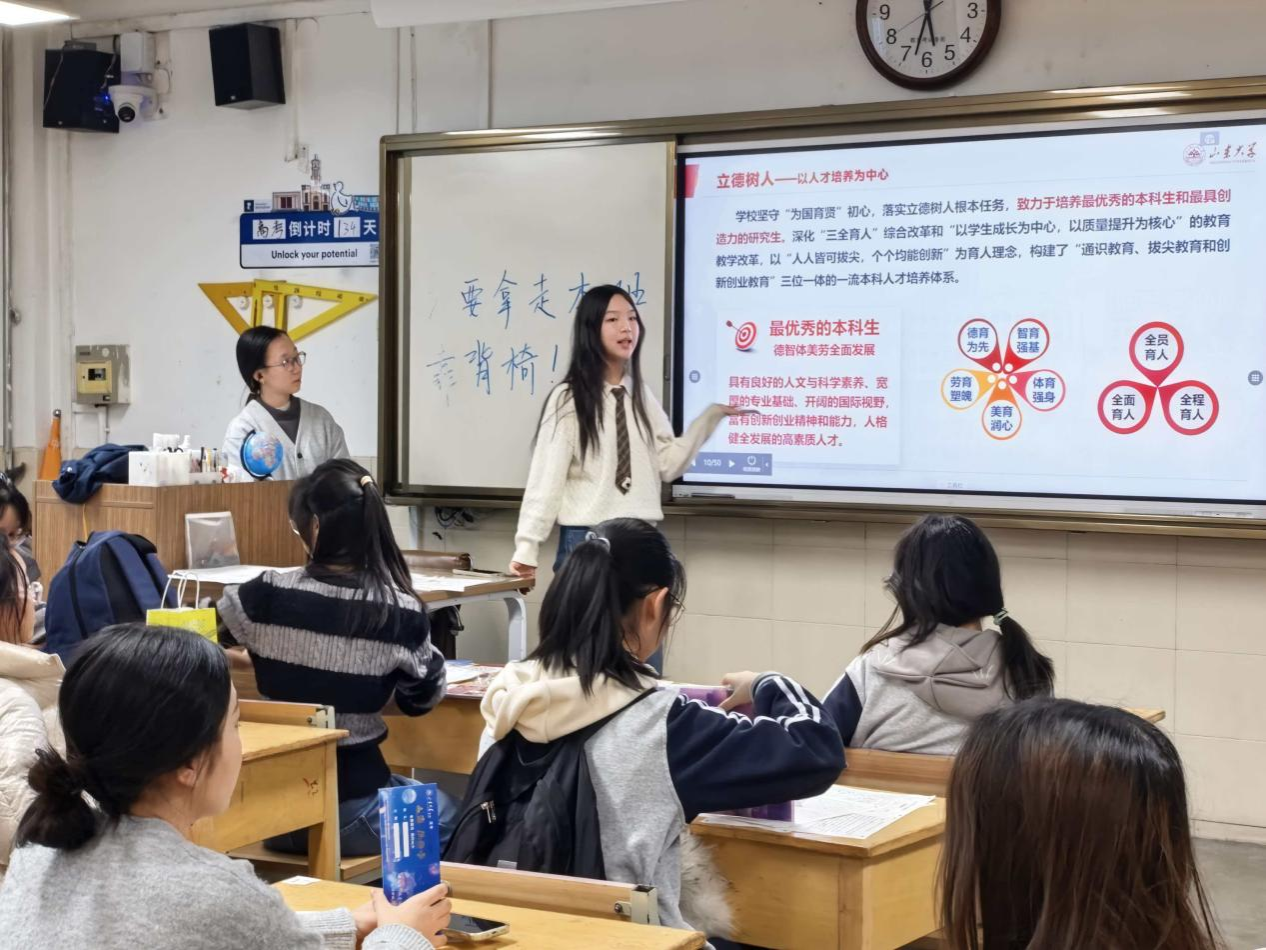启动仪式结束后,团队来到高三(2)班进行班级宣讲。针对该班政史地选科特点,主讲人冯顺仪围绕百廿校史、学科门类、培养机制及适合选科报考的特色班级等内容,结合视频、图片等多种形式,生动呈现山大校园文化、五育活动与生活条件,帮助学弟学妹更直观地感受大学生活。同时,主讲人结合自身备考经历与大学学习感悟,分享高考冲刺技巧与心态调整方法,激发同学们的备考动力。这场面对面的交流,不仅传递了山大魅力,更点燃了高三学子心中的梦想之光。