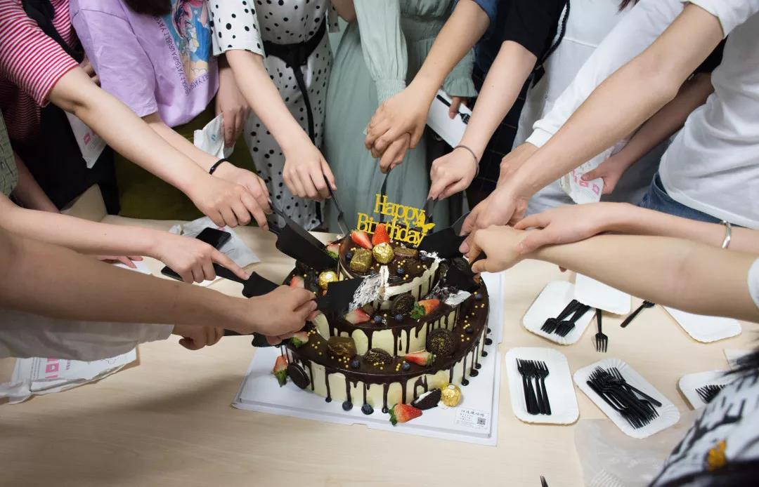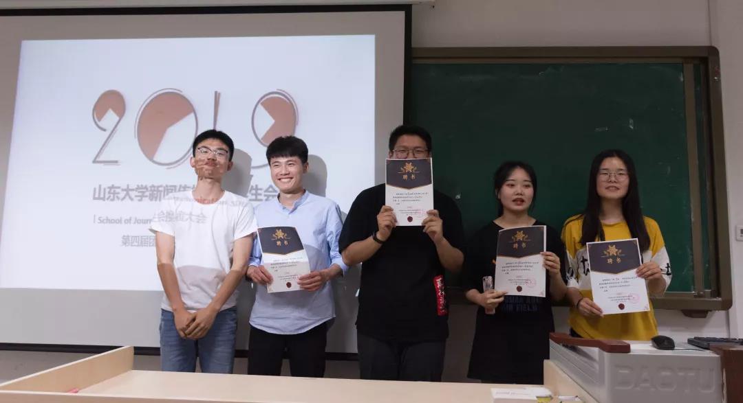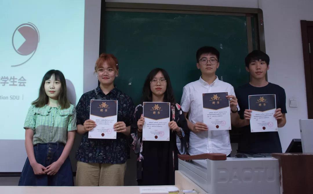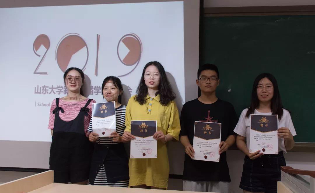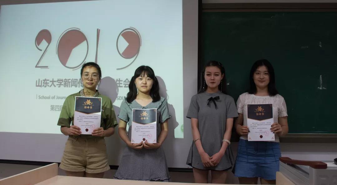 第三届各部门部长为第四届组织成员颁发聘书并合影留念。颁发完聘书后,第三届各部门部长一起切开蛋糕。