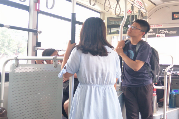 (队员赵凯文和黄月鹏在K48路公交车上采访)