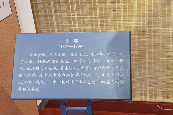 接着,我们走进曲山艺海博物馆,想要进一步了解“曲山艺海”这一称号的由来。在博物馆二楼的一个展厅内,书写在宣纸上并由竹帘衬底的几幅字吸引了我们的注意。总感觉其中对场景的描写十分眼熟,这时,身边的一位游客对他的同伴说,这些文笔十分类似于中学时代学过的《口技》一文,我们这才回味过来这股熟悉的感觉来自于名篇《口技》。同为描绘曲艺表演的盛况,今天看到的这些文字没有京味,而是带上了一股独特的济南地方特色。在旁边的一块展牌上我们了解了作者刘鹗的生平,以及这些悬于墙上的文字的出处。再回头来看这些文字,对它们的理解更深了。