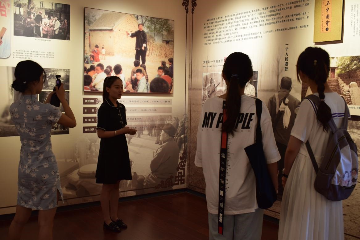 博物馆的讲解员张老师热情地接待了拍摄团队全员。在拍摄之前,张老师带领队员们参观浏览了博物馆并进行了细致地讲解。张老师告诉队员们,历史上济南曾有“曲山艺海”的美誉,曾经和北京、天津并称为中国曲艺的三大码头,这就是曲山艺海博物馆名称的由来。跟随张老师的脚步,队员们依次走进曲山艺海古溯源、南腔北调聚大观、说书唱戏汇泉城、艺海玉振启后人四大展厅,通过阅读文字图片展板、影像资料,观看复原景观、微缩模型、名人雕塑,体验沉浸式互动设备等方式,探寻济南曲艺历史济南曲艺历史的渊源脉络、沿革变迁,领略近现代时期济南的传统曲艺代表人物风采,了解济南当代的曲艺发展状况。