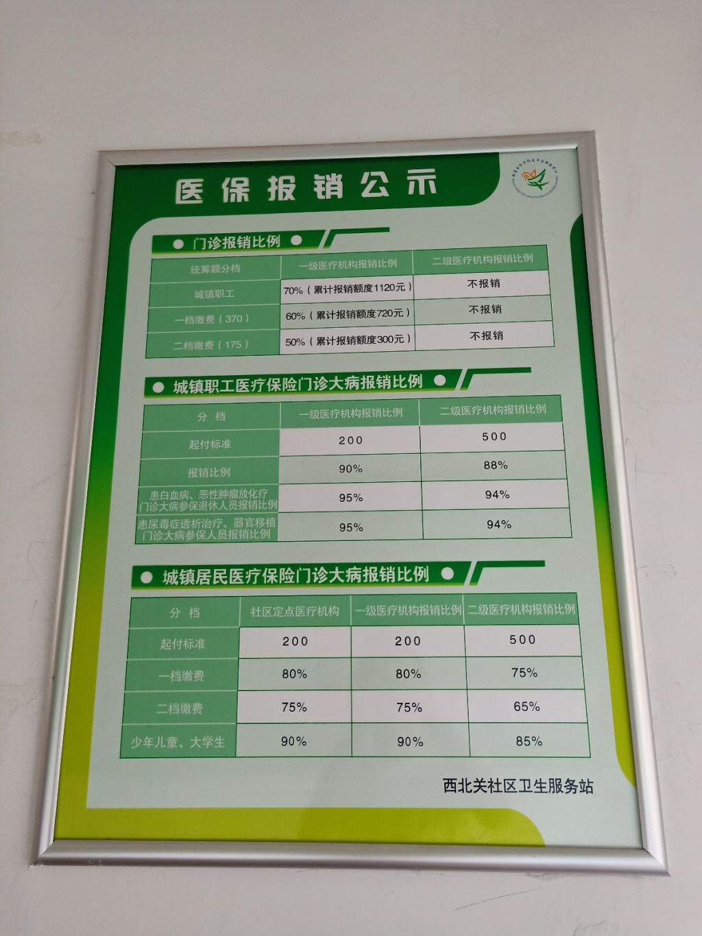 鉴于调研团主要调研的是养老产业发展及健康大数据应用情况,团队成员走近卫生服务站进行了深入调研。首先,在卫生服务站外,我们可以看到一个医保报销公示,这个公示不仅仅是针对老年人,是对社区内所有居民适用的,较为透明地说明了城镇居民职工在一级、二级医疗机构的报销比例。