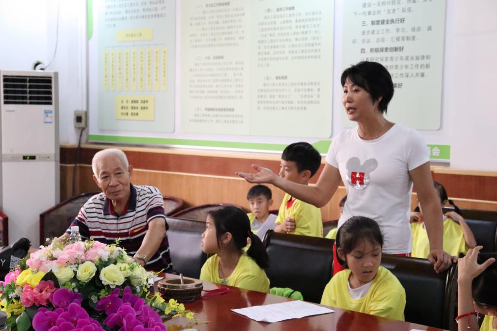 几遍跟唱后,小朋友们逐渐能够完整地唱下全首曲子了,文叔又将小朋友们分成几组,让孩子们进行小竞赛,进一步激发孩子们的学习热情。休息时间,文叔邀请去年就参加过夏令营的两位小朋友进行了龙舟歌演唱,两位小朋友声音稚嫩,但唱法娴熟,让人听到龙舟说唱未来发展的希望。其他两位非遗传承人婆婆也趁着休息的空闲为孩子们演唱了《凿壁偷光》、《愚公移山》等以经典故事改编的龙舟歌曲目,劝谕孩子们勤奋学习、做事不要轻言放弃。第一次听到书上寓言故事以再熟悉不过的顺德音粤语唱出来,孩子们感到新奇好玩,都围在婆婆身边仔细聆听,还不时探头看词,想要提前知道下面的唱句。