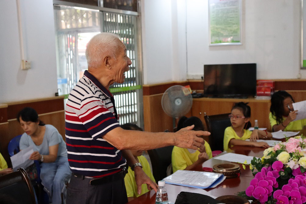 八月二十六日,在上次“非遗文化——龙舟说唱”讲座上与“文叔”(冯新文非遗传承人、杏坛龙舟说唱协会副会长)结识后,文叔邀请我们今日到梁銶琚文娱康乐中心观看他及另外两位非遗传承人婆婆对参加佛山艺术文化公益夏令营的孩子们进行龙舟说唱的教学。
