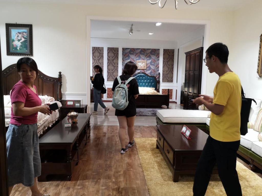 队员们在队长的带领下驱车来到宁津县三岭家具城,该家具城根据桌椅家具的质量品牌目标客户等划分为了成品A、B、C等成品展示厅。团队成员们首先参观了面向中低端消费群体的家具批发区块,刚进入展厅映入眼帘的是各式各样林林总总的桌椅家具,我们随机对不同品牌处的销售人员进行了采访。大部分商家对我们的到来表示欢迎并积极地配合我们的采访,当被问到日前的家具销售是否受到相关环保政策的影响时大部分的受访者都表示肯定,商家们表示环保政策在一定程度上给销售带来了挑战,但是同时也倒逼生产商提高生产技术,科学化生产程序,精化产量,为生产更加符合国家要求质量更优的产品做了铺垫,在短期来看也许会对销售业绩有所打击,但是从长远发展的角度考虑,这是实现家具产业可持续发展的必要政策和措施。